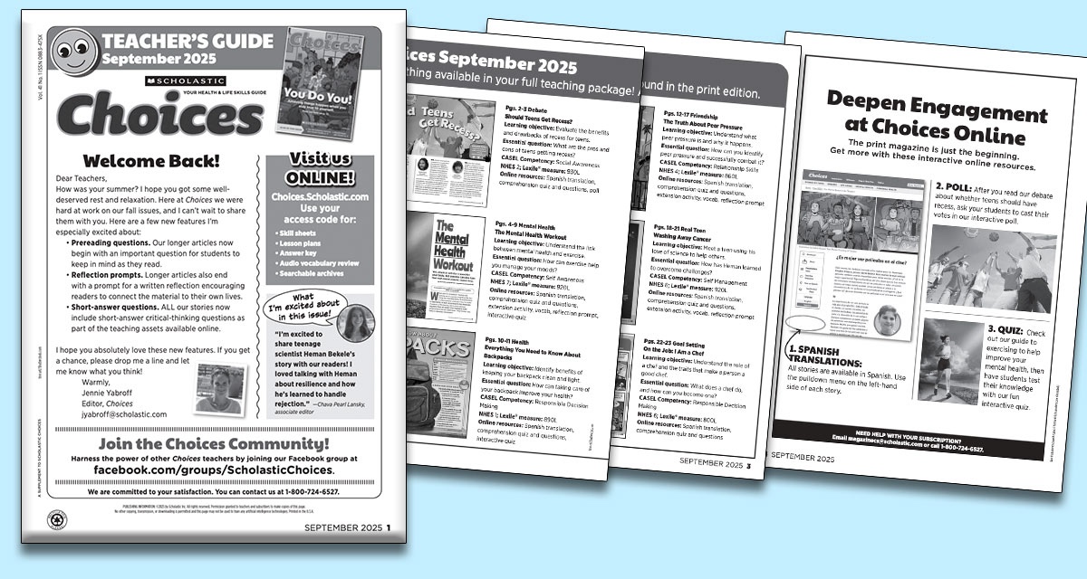 Each issue of Choices comes with a wealth of resources, including leveled articles, videos, printable activities and more. Watch this quick video to see everything you get with every issue, or keep scrolling to learn more about lesson plans, skill building activities, presentation view, and videos.